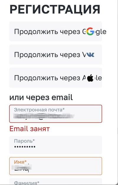 - Например, платформа пишет "email занят".