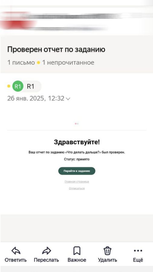 - Если задание проверяет преподаватель, дождитесь оповещения на почту. В письме нажмите на кнопку "Перейти к заданию", чтобы увидеть комментарий или совет: